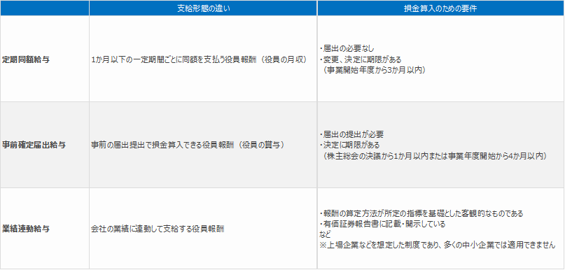 損金算入のための所定の要件とは、「定期同額給与」「事前確定届出給与」「業績連動給与」の3種類のいずれかを満たすことです。