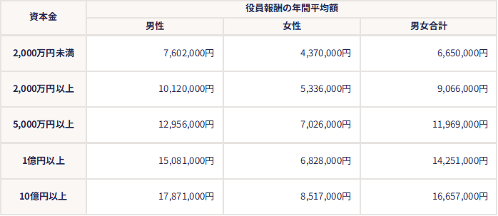 なお、令和6年における株式会社の役員報酬の年間平均額(資本金別)は以下の通りです。